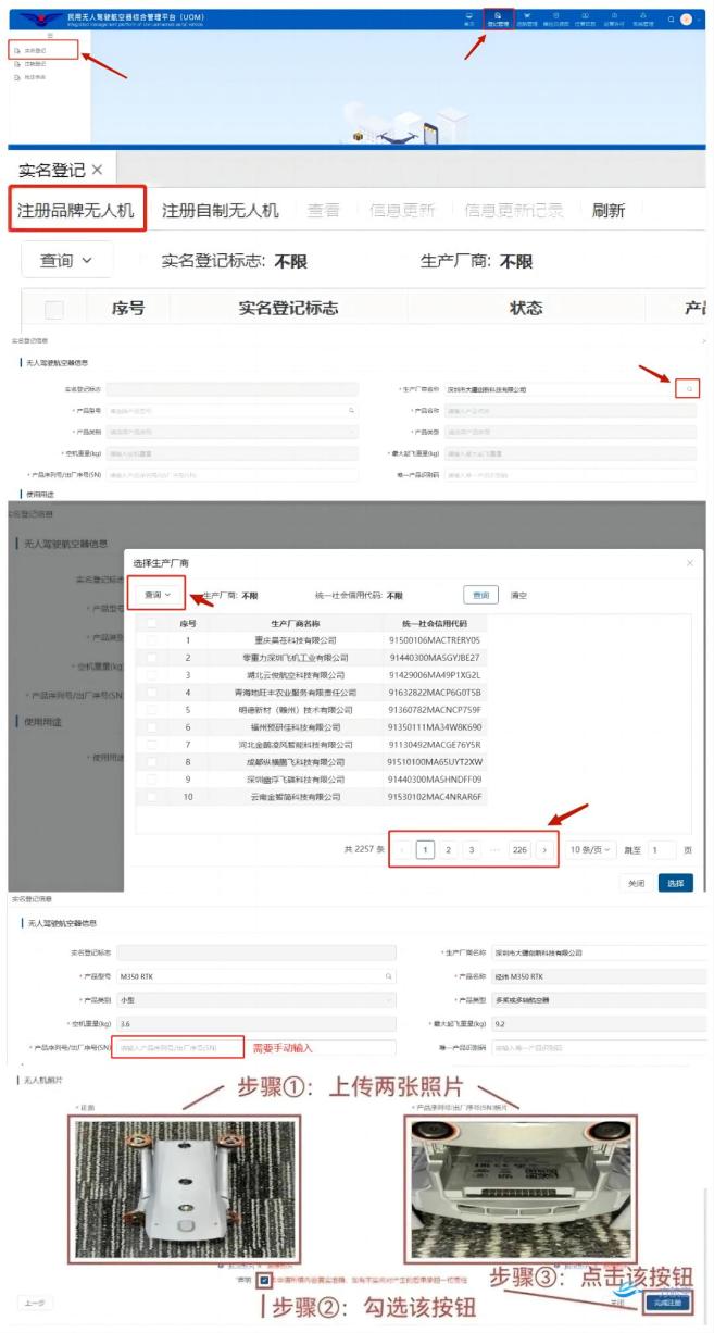 登錄好進(jìn)入首頁——點(diǎn)擊右上角登記管理——實(shí)名登記——注冊(cè)品牌無人機(jī)——驗(yàn)證所有人信息——手機(jī)掃碼刷臉驗(yàn)證——選擇生產(chǎn)商名稱(可一頁頁看,也可直接輸入搜索)——選擇型號(hào)等相關(guān)信息(序列號(hào)需手動(dòng)輸入)——根據(jù)要求長(zhǎng)傳照片——完成注冊(cè)。